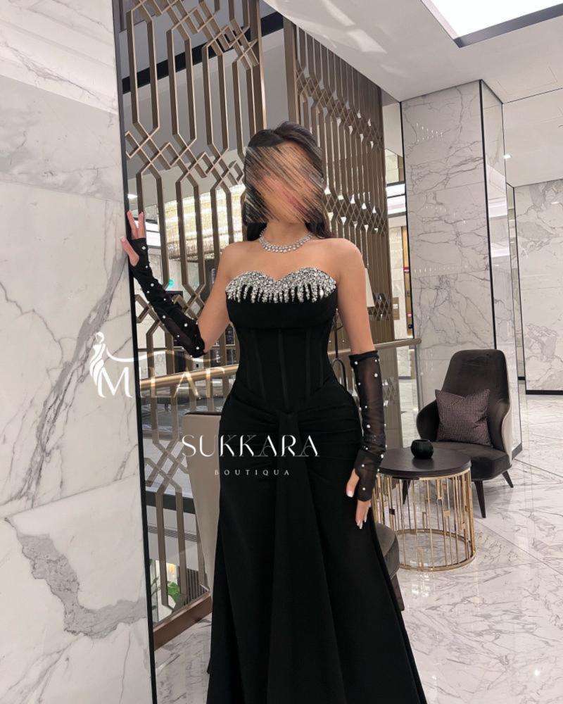 فستان أسود أنيق طويل، بتصميم بدون أكمام وزخارف براقة على الصدر، مع أكمام شفافة منفصلة تضيف لمسة عصرية وفخامة.