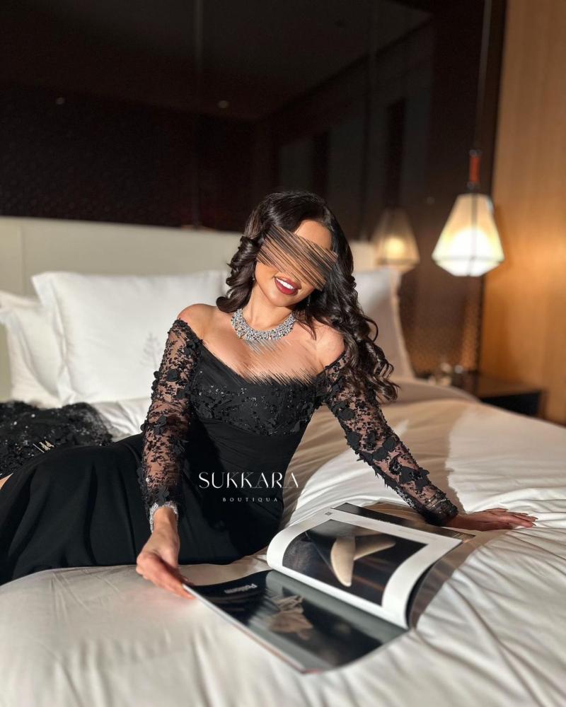 ““فستان أسود فاخر بتصميم أنيق وجذاب، يتميز بقصة أوف شولدر وأكمام دانتيل مطرزة بدقة، مع شق أمامي وذيل طويل مزين بالتطريزات اللامعة لإضفاء لمسة من الفخامة والرقي.”