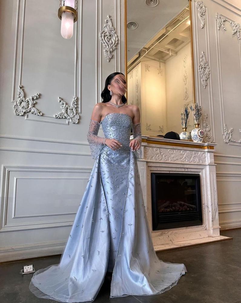 تصميم أنيق ، يتميز بقصة الكتف المكشوفة مع أكمام شفافة مرصعة بالخرز اللامع، مما يضفي لمسة ساحرة. تنسدل التنورة بطبقة شفافة ومطرزة بتفاصيل ناعمة تضفي فخامة وأناقة على الإطلالة.