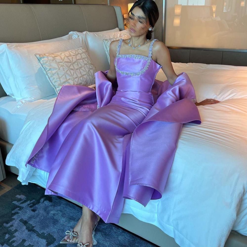 فستان أنيق باللون البنفسجي الفاتح يتميز بالفخامة والجمال. مصنوع من قماش الساتان اللامع الذي يعكس الضوء بطريقة رائعة ويضيف لمسة من الفخامة.